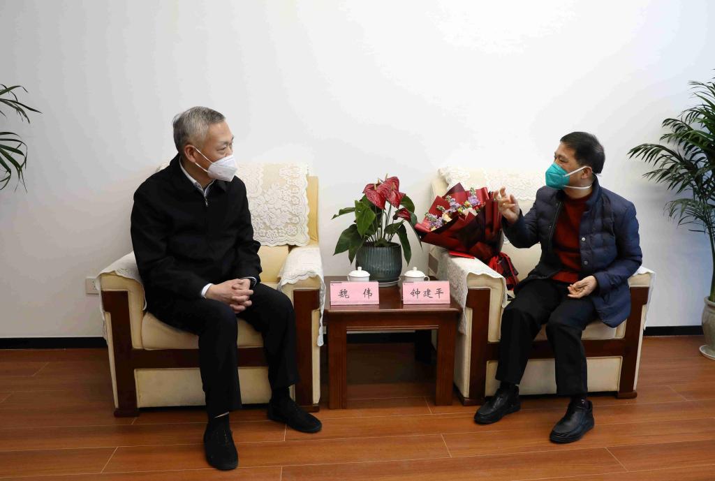 1月4日下午,绍兴市政协主席魏伟专程来校慰问我校高层次人才、附属医院主任中医师钟建平。市政协秘书长王旭波,市卫健委副主任、党委委员倪伟昶,市委组织部部务会议成员、市委人才办专职副主任娄丹丹等陪同慰问。校党委副书记沈赤,副校长黄坚,校党委委员、组织部部长、人才办主任宣绍龙,党办、校办、人才办、附属医院相关负责人等参加慰问活动。