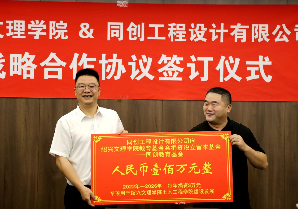 会上举行了“同创教育基金”捐赠仪式,同创决定在土木学院设立100万元留本基金。汪俊昌向钱彪颁发捐赠证书;陈均土代表学校接受捐赠;校对外联络处处长、教育基金会理事长陈立与李振宇签订捐赠协议。学校与同创设计签订全面战略合作协议,基本达成100多万合作项目1个,附属医院、土木工程学院与同创设计签订党建共建合作协议,学校在同创设计设立大学生教学实践基地、大学生就业创业实践基地。