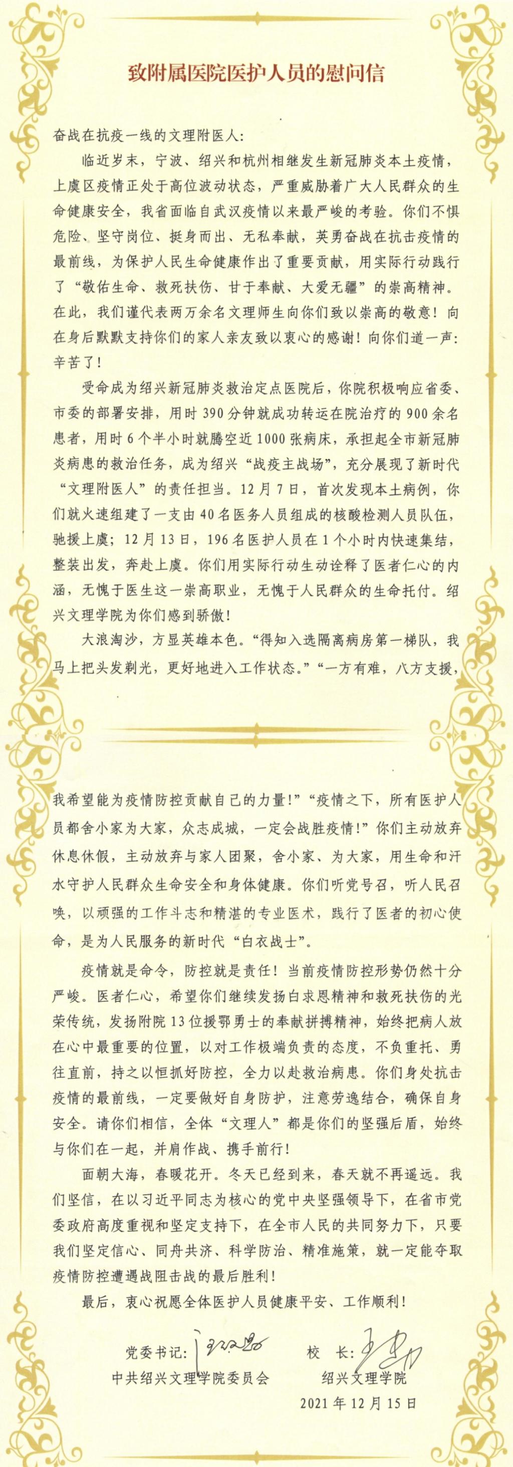 临近岁末,宁波、绍兴和杭州发生新冠肺炎本土疫情,附属医院医护人员不惧危险、坚守岗位、挺身而出、无私奉献,英勇奋战在抗击疫情的最前线,为保护人民生命健康作出了重要贡献,用实际行动践行了“敬佑生命、救死扶伤、甘于奉献、大爱无疆”的崇高精神。校党委书记汪俊昌、校长王建力代表两万余名文理师生向附属医院医护人员致慰问信,表达崇高敬意和衷心感谢。