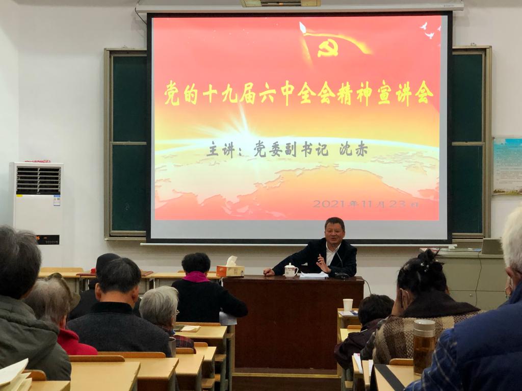 沈赤对十九届六中全会精神进行了深入解读。沈赤指出,中国共产党第十九届中央委员会第六次全体会议最重要的成果,是审议通过了《中共中央关于党的百年奋斗重大成就和历史经验的决议》。《决议》指出,党和人民百年奋斗,书写了中华民族几千年历史上最恢宏的史诗,提出我们党在四个历史时期创造了四个伟大成就,理论创新实现了三次飞跃。他指出,党的百年历史,是一部矢志践行初心使命不懈奋斗的历史,党团结带领人民筚路蓝缕、砥砺前行,为实现中华民族伟大复兴创造社会条件、奠定制度基础、提供体制保证和物质条件,取得了四个伟大成就,提出了一系列原创性思想、进行了变革性实践、取得了突破性进展和标志性成果。“后之视今,亦犹今之视昔”。他希望与离退休党员们一起更加深入地学习,更好地理解党的历史,从而加深对全会精神和《决议》的理解与贯彻。