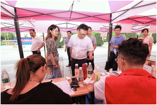 “同学们在吃饭了,慢慢吃,大家辛苦了!”正值中午,校领导汪俊昌、陈均土来到迎新现场,亲切看望忙碌之余正在吃饭的迎新工作人员和学生志愿者,向他们表示关心与问候。在各分院报到点,汪俊昌向分院有关负责人详细了解新生报到情况和迎新各项工作落实情况,与迎新一线的师生和志愿者进行亲切交谈,对大家的辛勤工作给予充分认可和赞赏。随后,汪俊昌一行来到学院西大门,走访检查了开学疫情防控工作部署落实和新生报到情况,对学院开学工作的平稳有序给予肯定。