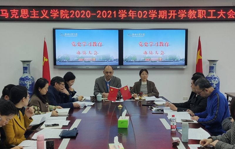 3月1日,在召开干部大会后的第二天,马克思主义学院全体教职工以专题理论学习会开启新学期的工作,重点部署“学党史、担使命”思政理论课“开学第一课”。会上,全体思政课教师原原本本学习了习近平总书记在党史学习教育动员大会上的重要讲话和学校干部大会精神。接下来,马克思主义学院将掀起党史学习教育的热潮。全面开展“学党史、担使命”“开学第一课”教学,实现本硕学生全覆盖;把党史学习教育纳入思政理论课教学重要内容,抓实课程实践创优行动,推进全市大中小学思政理论课一体化建设试点;开展全校学习党史理论微课竞赛、知识竞赛等活动;开展以越地红色文化为主题的课题研究;组织思政专业学生“四史”理论宣讲进书院、进学校、进社区、进村镇。