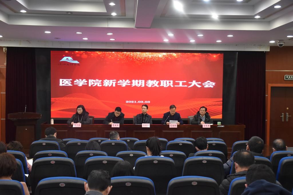 3月3日,医学院在财贞楼二楼报告厅召开2021年新学期教职工大会,传达学习学校2021年新学期干部大会精神,部署安排学院2021年重点工作。会议强调要进一步解放思想、提振精神、抓实工作,确保各项工作和任务落到实处。医学院将充分认识医学教育的特殊性,高度重视提高办学质量,提高辨别度,提高科研产出;深化服务好地方,托住乡村卫生院的公共卫生网底,着力为农村和乡镇定向培养大专生、本科生;努力在医疗对口支援、中西部医学教育扶助上作出新贡献,展示浙江的担当意识和窗口形象,切实做好绍兴市与贵州六盘水市有医疗帮扶项目。学院将以“步子快一点、动作快一点、对外拓一点”的干劲和决心,以时不我待、只争朝夕的精神投入工作,力争真正做到各项任务的落地、落细、落实。