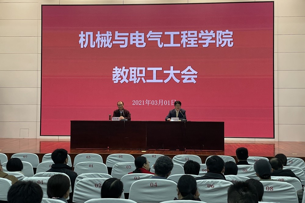 3月1日,机械与电气学院在铁城科教馆报告厅召开全体教职工大会,传达学习学校2021年新学期干部大会精神。会上,学院领导班子结合学校二级学院工作实绩考核指标体系,从党建与思想政治工作、人才培养、师资队伍、科学研究与社会服务、学科专业建设、国际交流、学院影响力等七个方面提出2021年工作目标和工作举措。学院将在“六个坚持”上持续发力:一是坚持党建引领。深入学习贯彻习近平新时代中国特色社会主义思想,组织开展党史学习教育,学党史、悟思想、办实事、开新局。二是坚持立德树人。全面推进“课程思政”,深化人才培养模式改革,不断完善课程体系建设,强化产教科教融合,切实提高应用型人才培养质量。三是坚持人才强院。引育并举,争取在高端人才、海外人才引进方面有新突破,努力打造一支以领军人物为引领、中青年骨干为生力军的人才队伍。四是坚持内涵提升。以需求为导向,提升专业与新工科建设的对接度,在硕士点建设、一流学科专业申报、专业认证和国际交流合作上有新突破。五是坚持服务地方。以服务地方为己任,在服务地方中求发展,创新地方合作机制,深化政产学研合作,大力推进校外研究院和合作平台建设。六是坚持科学治理。推进学院治理体系和治理能力现代化,完善科学规范、以人为本、学术为先的治理架构,着力营造风清气正的学院氛围。