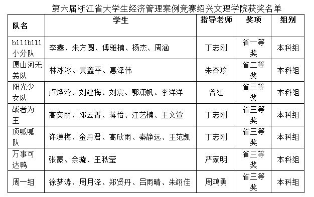 近日,经过网评和答辩,由浙江省大学生科技竞赛委员会主办的第六届浙江省大学生经济管理案例竞赛落下帷幕。本次竞赛全省共计本科414支队伍、专科99支队伍参加。我校选送了12支队伍参加了本次竞赛的本科组角逐,最终获得了一等奖1队、二等奖1队、三等奖5队的好成绩。