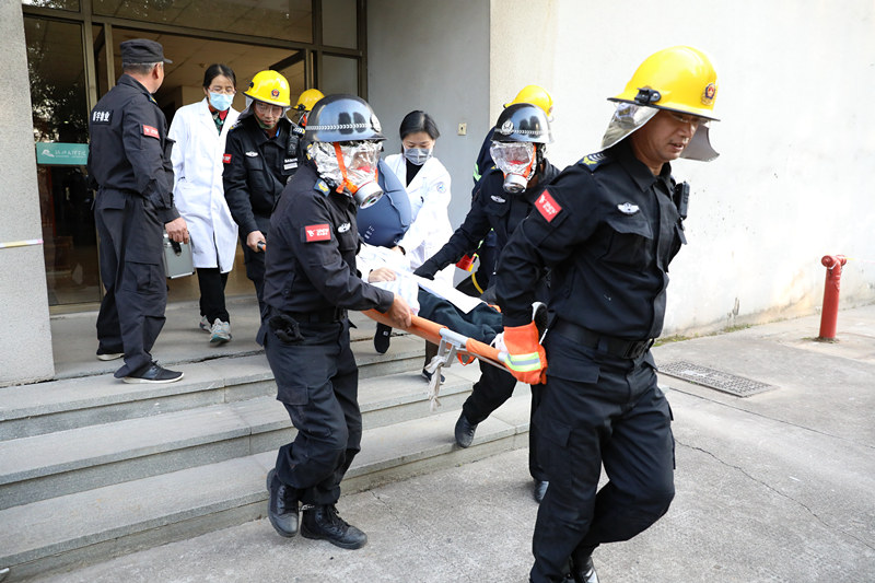 演练现场,4号楼415实验室突然出现一阵白色烟雾,有学生在化学试剂爆炸燃烧反应中受伤,实验管理人员发现险情,立刻组织同学安全疏散,并向校园“110”、消防“119”报警。一百多名学生一个挨一个,在5分钟内有序撤离大楼。片刻校卫队员、医疗救护组赶到现场,分别投入火情扑救和实施相应医疗救援……整个演习过程气氛紧张却井然有序。