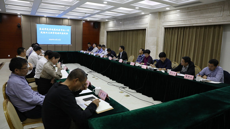 10月14日下午,盐城师范学院党委书记戴斌荣率党委副书记、纪委书记刘必清,副校长汤克明、毕凤珊,党委常委、组织部部长于建江,党委常委、宣传部部长冯永玲等一行11人来我校考察,就新时代高校党建工作、学校“十四五”规划编制和年轻干部培养机制等相关事宜展开交流。我校党委书记汪俊昌,党委副书记沈赤,副校长寿永明,党委委员、组织部长宣绍龙,党委委员、宣传部长梁瑜等接待来访,党委办公室、党委统战部、纪检监察室、发展规划处、团委、信息与教育技术中心、教务处等部门负责人陪同座谈。
