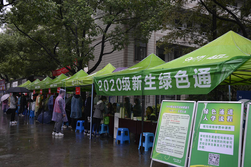 尽管秋雨绵绵,但报到工作开展得井然有序,各学院、部门早已做好充分的准备。鲜艳的欢迎横幅在校园里招展,校园道路两侧清晰醒目的指示牌,一个个迎新帐篷顺序摆放。