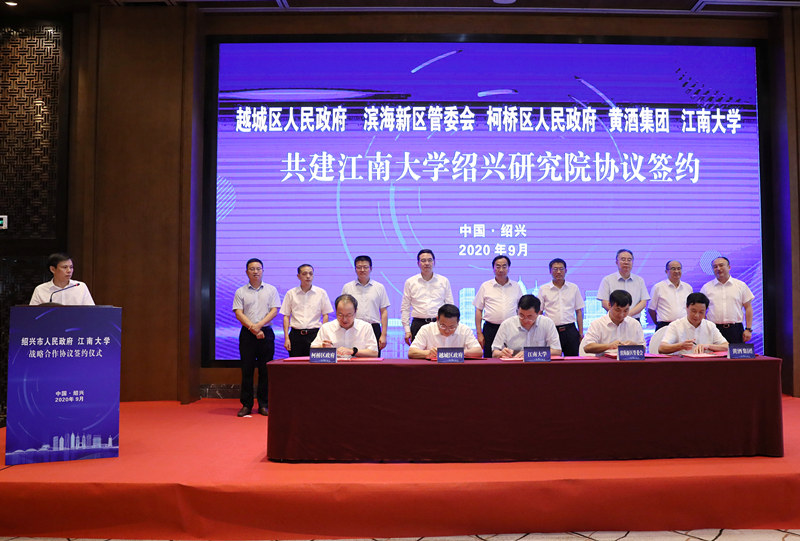 越城区政府、柯桥区政府、滨海新区管委会、黄酒集团与江南大学签订共建绍兴研究院协议。