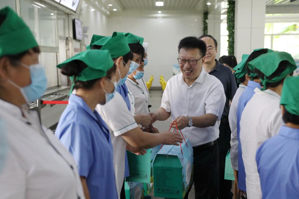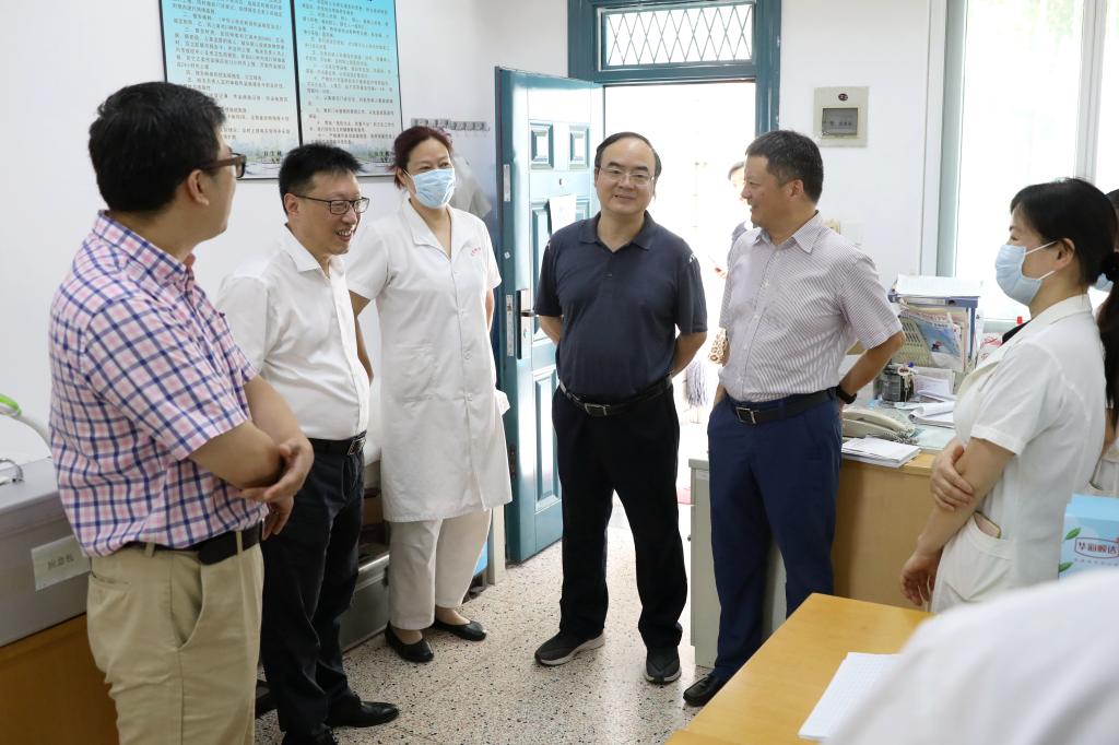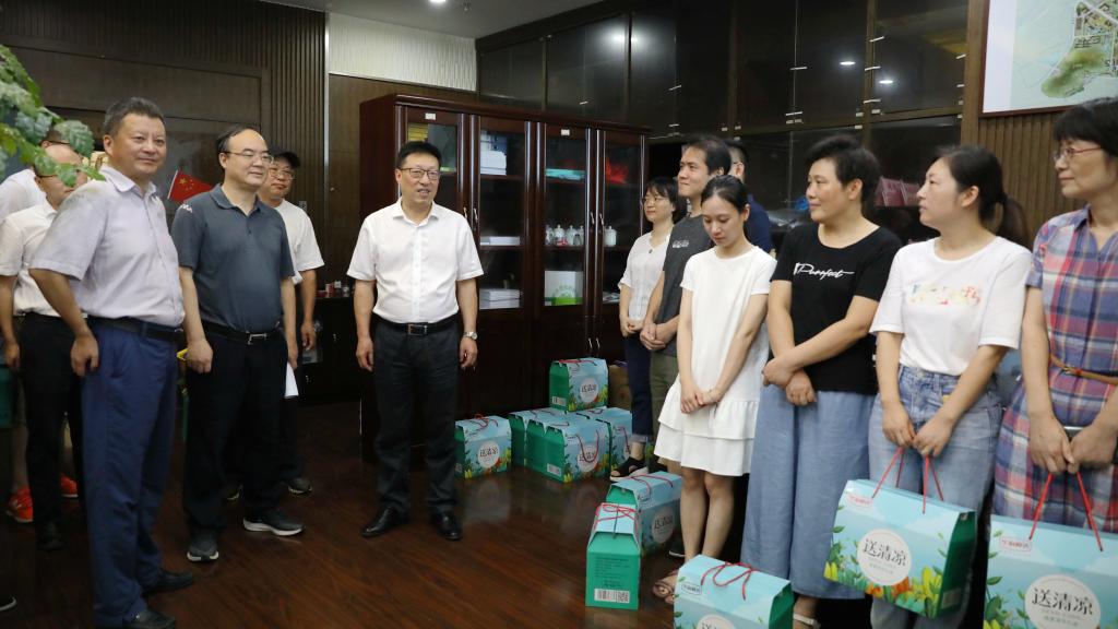 汪俊昌一行先后来到招生办、校园改扩建办、校医务室、河西餐厅、南山校门物业、阳明书院等工作岗位。每到一处,汪俊昌一行都与在岗教职工们亲切交谈,详细询问他们近期工作、生活、身体等情况,嘱咐大家继续把牢疫情防控关,做好各项工作,同时要注意劳逸结合、防暑降温,并代表学校对大家的辛勤付出表示由衷的感谢。