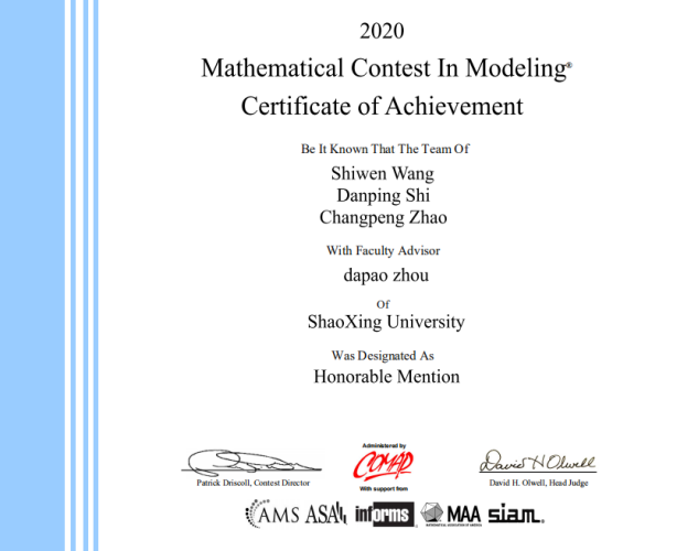 近期,2020年美国大学生数学建模竞赛(MCM/ICM)结果揭晓,绍兴文理学子获得Meritorious Winner奖2项,Honorable Mention奖 3项。这是继我校2019年在该赛事上取得的又一次优异成绩(2019年获得Meritorious Winner奖2项, Honorable Mention奖2项)。