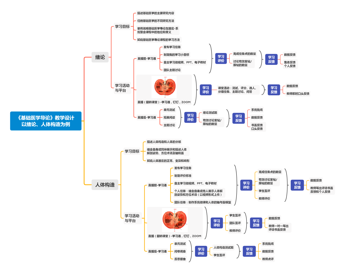 依据布鲁姆认知目标分类法进行分层教学。直播前,设置学生在学习任务单的指导下,通过观看微视频、PPT等掌握的基础性内容达到基础目标;直播(在线翻转课堂),运⽤番茄法(见思维导图),通过直播精讲,案例分析、小组研讨、互动释疑等来实现提升认知、解决重难点的高级学习目标;直播后,通过单元测试、拓展阅读、小组专题讨论等达到激发学生思维,培养学生的思维能力、观念和自我评价的高级目标。