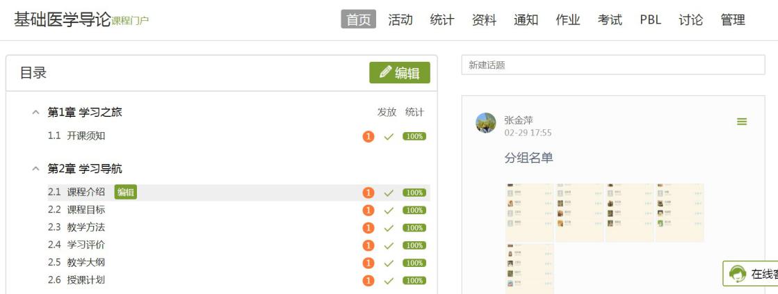 本课程3月9日正式开课,开课前2周发布了学习之旅、温馨提示、线上教学、开课须知、班级分组等内容。