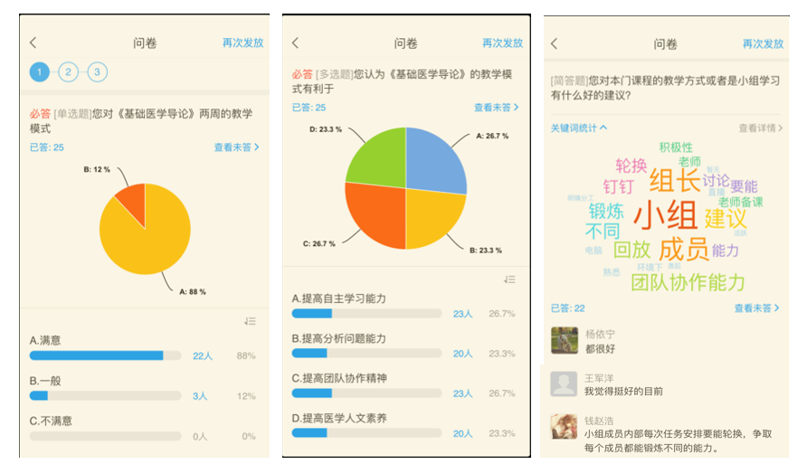 4.大数据是实施在线翻转课堂的精准条件  通过超星学习通在线学习大数据分析来实行线上教学实时反馈、督促与管理,通过邮件或短信督促学习计划滞后的学生,使其养成主动学习的良好行为,课程浏览量达104724人次,充分提高了学习效率。经过两周的线上教学数据表明,学生线上生生互动、师生互动参与度高;通过数据分析,88%的学生对在线翻转课堂教学模式满意, 92%的学生认为这种教学模式有助于提高自主学习能力和团队协作精神,80%的学生认为有助于提高自己分析问题的能力和医学人文素养。有的学生建议小组成员角色转换,使每个成员都能得到不同的锻炼能力。