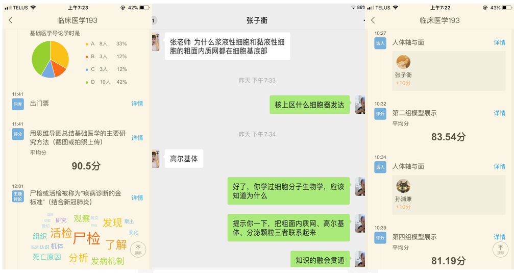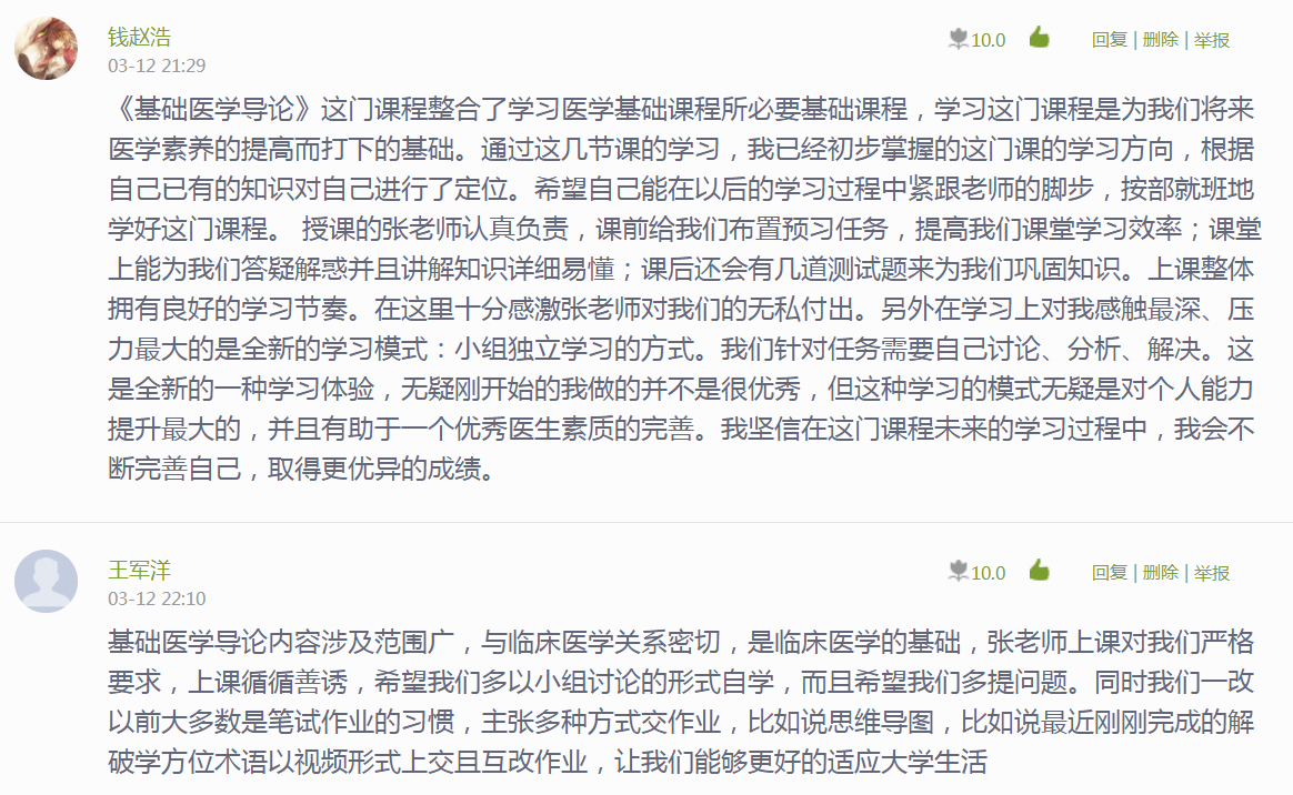 以学为中心,有效地利用超星学习通、钉钉、ZOOM等网络平台贯穿于在线课程教学过程,搭载“学、问、思、用”系统化流程,使学生真正参与到学习过程中,并取得了良好的效果。高质量的师生、生生交互学习活动,使本课程在线教学短短2周内受到了学生们的赞同和好评。我也被学生的纷纷留言深深感动,同时深刻领悟到,在疫情背景下,如何使在线翻转教学更有效,最核心的就是依据学习目标,设计高质量的交互教学活动,通过优良的学习活动设计,多元的学习评价,及时的督学反馈,遵循OBE理念,实践“学生中心,产出导向,持续改进”的在线课程学习。