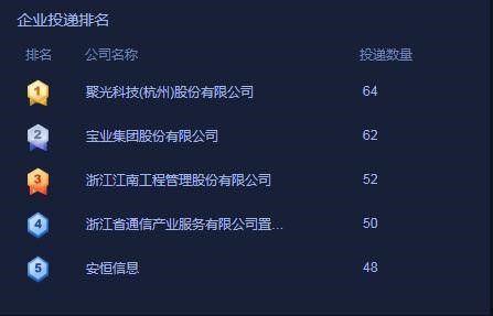 聚光科技(杭州)股份有限公司最多,收到简历64份,其次是宝业集团股份有限公司,收到简历62份。