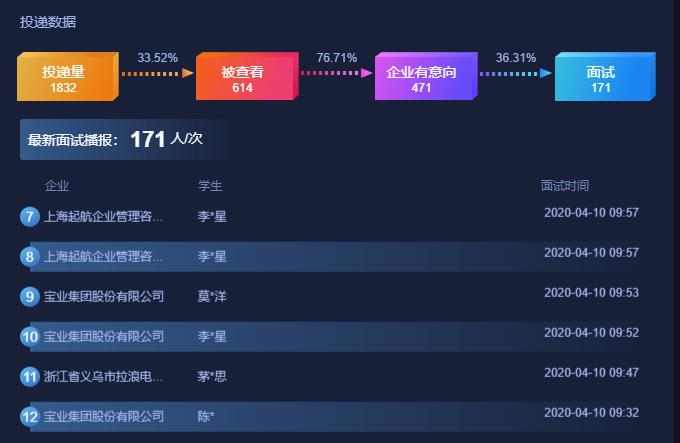 宅家不宅心,岗位“云招聘”。新冠肺炎疫情暴发以后,学校暂停举办各类线下现场校园招聘会、宣讲会等活动,联系用人单位积极探索精准化“空中招聘”模式,依托“互联网+就业”线上服务平台发布招聘信息、组织宣讲、收取简历等,开拓线上招聘渠道,提供日常招聘服务。通过“绍大创就业”公众号、就业信息网站推送企业招聘信息600余条,发布企业招聘岗位需求6000余个。截至目前,已举办春季大型综合类“空中双选会”2场,“企业与文理学子面对面”网络直播专场招聘会5场,各类专场招聘会10场。参与企业800余家,提供就业岗位35200余个,毕业生投递简历4500余份,700余名毕业生与企业达成就业意向。