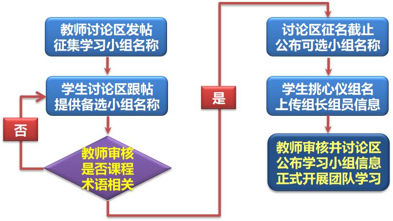 4.组建课程学习小组开展团队合作学习。根据线上线下混合式教学特点,为活跃课堂互动氛围,要求组建团队学习小组,并要求每个学习小组取课程内容相关的组名,流程如下: