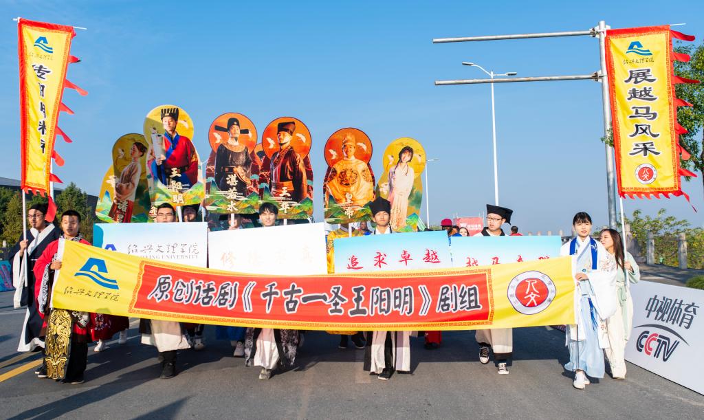 我校方阵由28个国家和地区的80名国际留学生、《千古一圣王阳明》话剧成员20人、教师代表40人组成。早上5点40分,我校师生就身着统一服装集体前往比赛起点——绍兴市奥体中心,7点30分,在校旗的引领下,我校运动员精神饱满,沿着风景秀丽的解放大道奋力开跑,在锻炼身心的同时,还尽情领略了古城绍兴的旖旎风光。