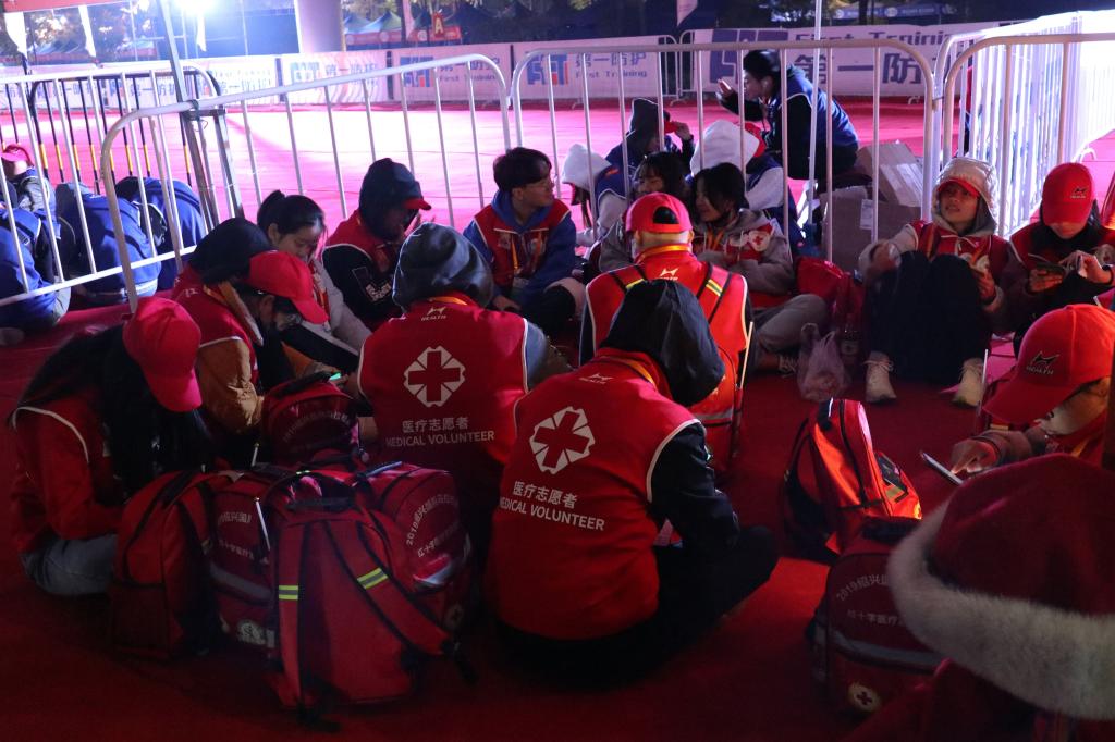 此外,我校1059名志愿者积极投身此项大型赛事的志愿服务工作。其中67名主会场志愿者,351名赛后拉伸志愿者,62名医疗喷雾志愿者,579名赛道观察志愿者。10日凌晨2点30分,志愿者们开始陆陆续续从宿舍赶往集合点;3点10分,人员集结完毕,车辆准时出发。夜色深重的文理,寂静清冷的凌晨因一位位文理志愿者的集合而变得生动鲜活,他们用辛勤的劳动为来自世界各地的选手们提供了热情的服务。