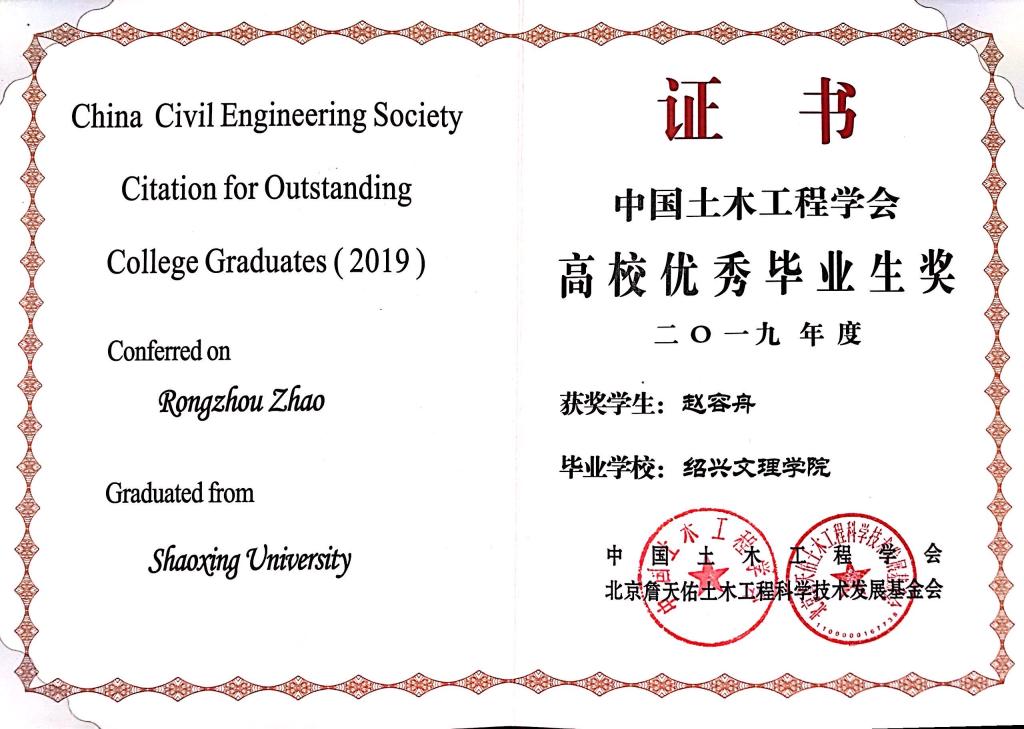 近期,我校土木工程学院2019届毕业生赵容舟喜获“2019年度中国土木工程学会高校优秀毕业生”称号。该奖项是土木建筑工程类专业高校毕业生的全国最高奖,此次是我校毕业生首次获得该奖项。