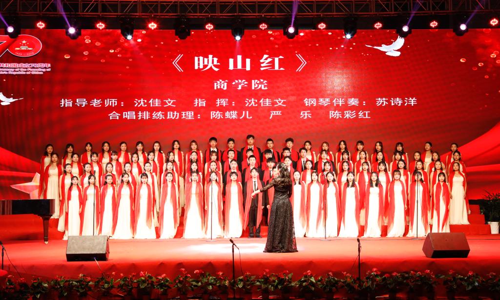 首先是兰亭书法艺术学院高歌《今天是你的生日》为祖国送上诚挚的祝福。医学院一曲《共筑中国梦》歌尽峥嵘岁月里对改革的喜悦、对未来的期许。商学院合唱的《映山红》,在悦耳动听的旋律中,体现出了人们对美好未来的憧憬与向往。