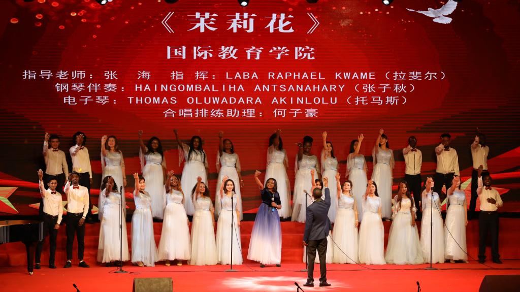 伴随着悠扬的旋律,数十位来自不同国家、地区的留学生走上舞台,齐声高唱中国传统民歌《茉莉花》,将气氛推向了高潮,不同肤色、不同国界的人在一起,为我们伟大的祖国献上最真挚的祝福。