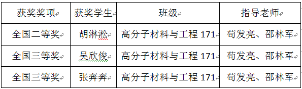 7月19—23日,由教育部高等学校材料类专业教学指导委员会主办的“首届全国大学生高分子材料实验实践大赛”在东华大学纤维材料改性国家重点实验室举办。我校化学化工学院2017级高分子材料与工程专业三位学生代表学校参加决赛。经激烈角逐,我校学子获二等奖一项,三等奖两项。