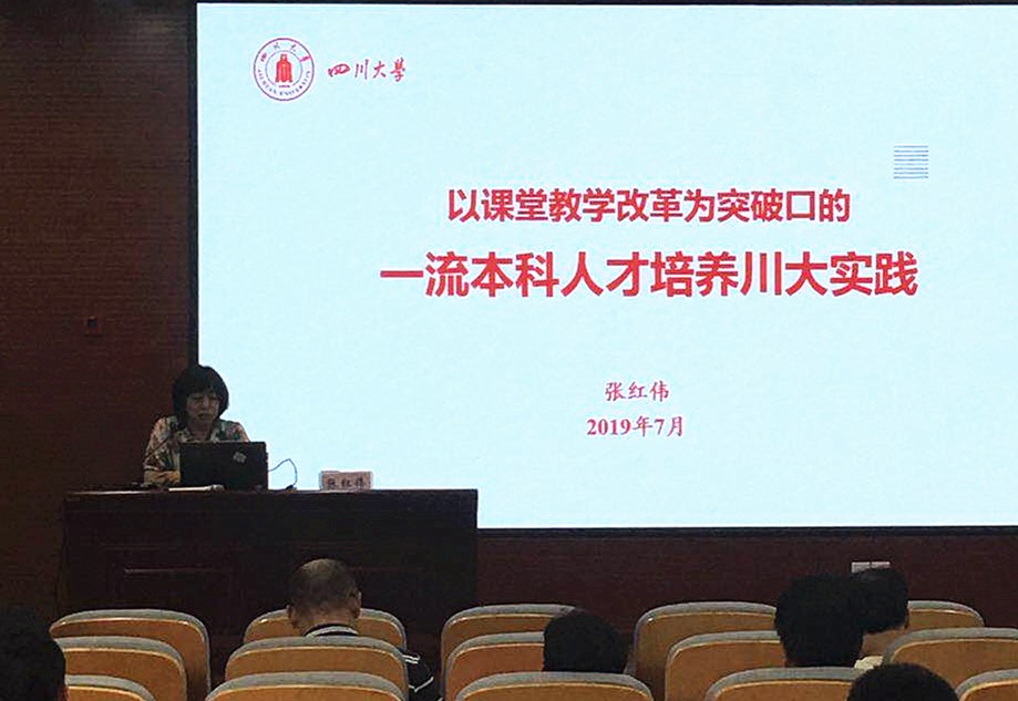 张红伟从“教师教学能力发展”“探究小班化课堂教学改革”“跨学科交叉人才培养”“高端国际化教育”“双创实践”“激励与保障机制”等方面,作题为《以课堂教学改革为突破口的一流本科人才培养川大实践》的专题讲座。张红伟指出,本科教育是一所大学发展的基石,一流本科教育是一流大学的立校之本。她提出,课堂教学改革是撬动全方位人才培养改革的重要措施,要抓住“45分钟课堂”主战场,全面推进课堂教学改革,以课堂教学改革为突破口,向课堂教学要质量。