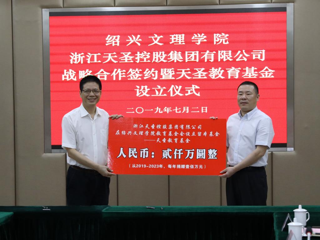 据悉,浙江天圣控股集团有限公司在2007年与我校纺织服装学院开展合作,设立了天圣奖助学金。今年,天圣控股集团有限公司与我校签订战略合作协议,并在我校设置2000万元留本基金,用于支持学校更名设置绍兴大学工作。