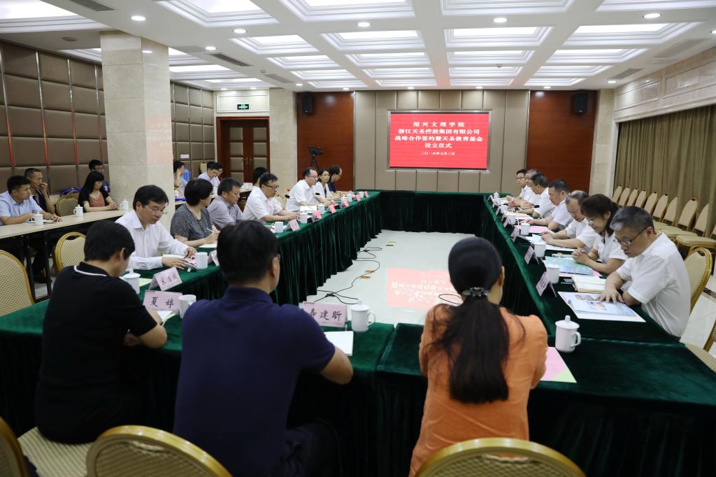 7月2日,我校与浙江天圣控股集团有限公司战略合作签约暨天圣教育基金设立仪式在铁城科教馆一楼会议室举行。天圣集团董事长孙永根、常务副总经理金国庆,校党委书记汪俊昌,校长王建力,党委副书记沈赤,副校长张宏,学校相关职能部处、二级学院负责人和天圣集团相关部门负责人出席仪式。张宏主持仪式。