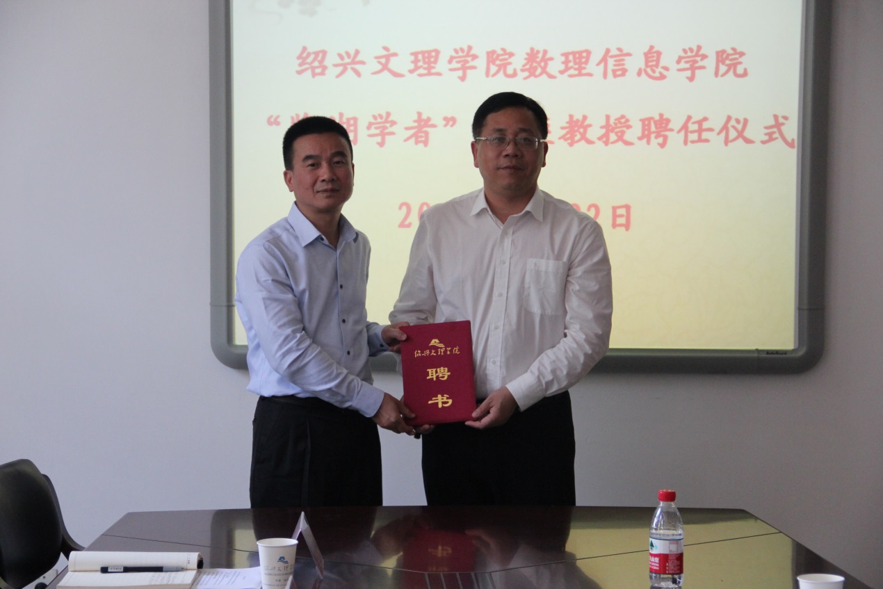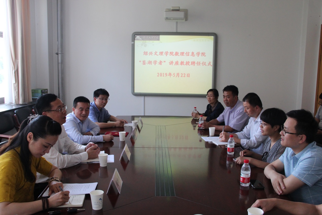 5月22日下午,学校在南山校区1号楼317会议室举行了简单而隆重的聘任仪式,聘请香港城市大学数据科学学院副院长、博士生导师周定轩教授为我校“鉴湖学者”讲座教授。副校长柳国庆出席仪式,数理信息学院、人事处相关负责人,数理信息学院各部门、系(部)、中心负责人参加仪式。