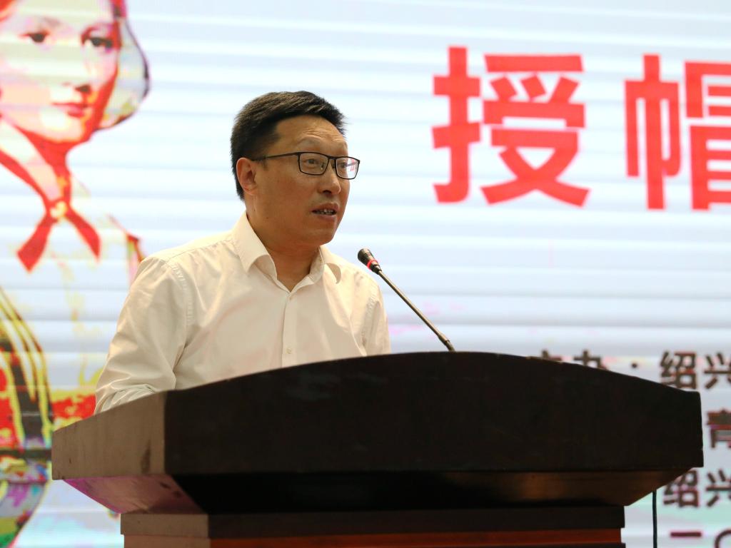郝敬习为姜小鹰教授颁发“鉴湖学者”聘书。