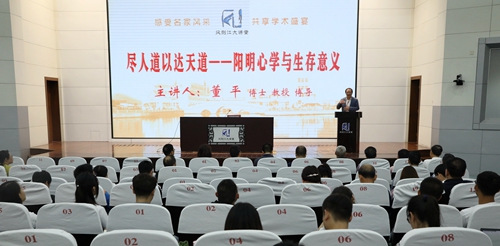 5月10日晚,浙江大学求是特聘教授、中国哲学博士生导师、浙江大学中国思想文化研究所所长、佛教文化研究中心主任董平教授做客风则江大讲堂,作题为《尽人道以达天道——阳明心学与生存意义》的讲座。校党委副书记沈赤,校党委委员、宣传部部长陈均土,师生和市民代表近400人参加讲座。
