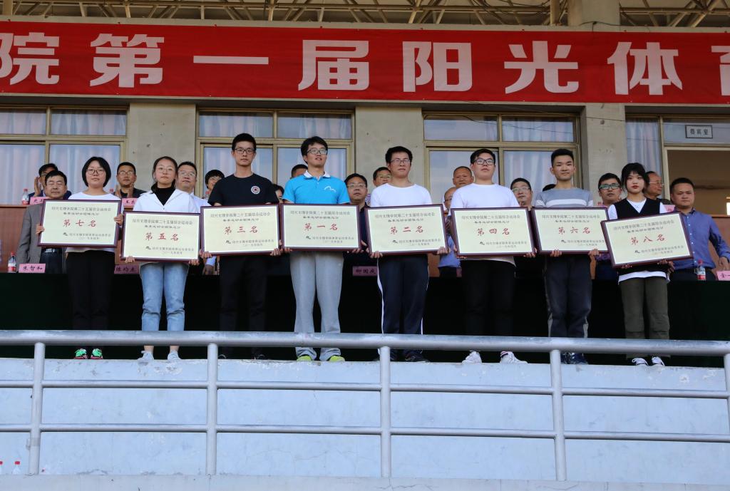 本届阳光体育运动会的主题为“笃行逐梦,聚力拼搏”,共有1446名师生参加了8项比赛,产生了11枚金牌。每个项目均有教师和学生共同参与,比赛形式多样,趣味丰富,包括呼啦圈过山车、跳长绳、旋风跑(接力)、大脚板接力等。赛场上,参赛师生热情高涨,齐声呐喊,比赛场面趣妙横生,欢笑声此起彼伏。经过激烈角逐,生命科学学院、化学化工学院、数理信息学院、土木工程学院、教师教育学院、纺织服装学院、外国语学院、元培学院获得团体前八名。