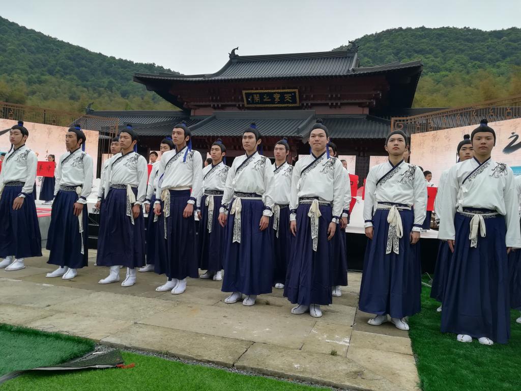 教师教育学院体育系仪仗队学生在开幕式演出中,统一束扎发髻,身着素雅汉服,有序进场。先于王右军祠举行“晋圣仪式”;主会场“迎宾鼓舞”环节中,在舞台前款款而立,或吟诵诗句,或举旗相迎;最后,在《书写中华》节目中,踩着悠扬的音乐与歌声,一步一停走至台前,或双手抱掌而立向大家行作揖礼,或拱手高举行长揖礼,举手投足间尽展风雅之姿。