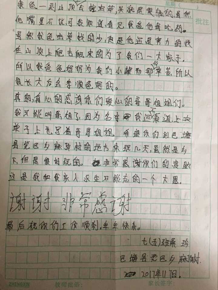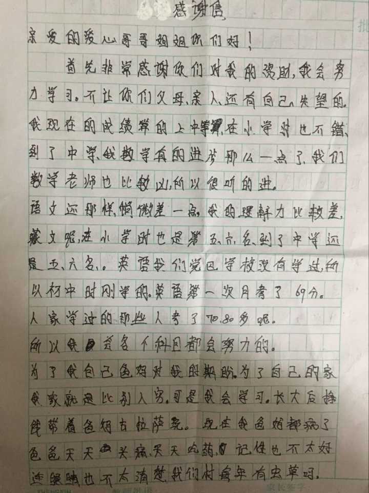2017年11月,一封来自叶紫樱参与结对帮扶的藏区孩子桑珍的信,让叶紫樱觉得所有的付出都有了最好的回报。记者了解到,桑珍在“格桑梅朵”公益平台的资助下现已经顺利进入初中三年级。