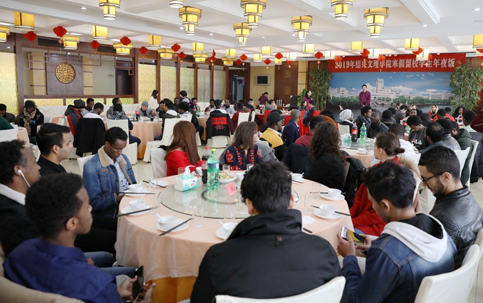 2月4日,农历除夕中午,河西餐厅对竹楼内欢声笑语,校长王建力与在校过年的百余名中外学生欢聚一堂,同吃“年夜饭”,一起迎接己亥新年的到来。党办校办、学工部、外事处、后勤管理处等部门负责人陪同参与。