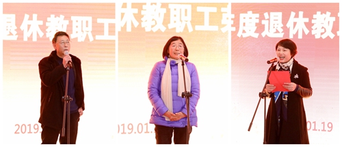 1月19日上午,学校在河西餐厅对竹楼举行2018年度首届退休教职工荣休仪式,为42位退休教职工举办集体荣休。校党委书记汪俊昌,校长王建力,党委副书记沈赤、郝敬习,副校长张宏及有关职能部门负责人参加了活动。汪俊昌在荣休仪式上讲话,沈赤主持荣休仪式。