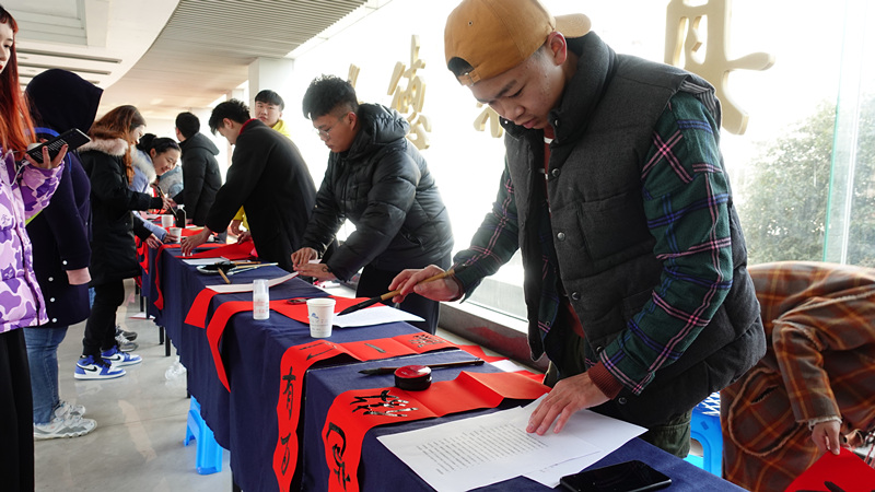 12月29日中午,兰亭书法艺术学院在河西行政楼前开展“迎新春,送春联”活动,20多名书法专业的同学现场挥毫,专心致志地写着对联,书写桌前被师生围得满满的,有求对联的,也有要“福”字的,现场洋溢着一股浓浓的新年气息。