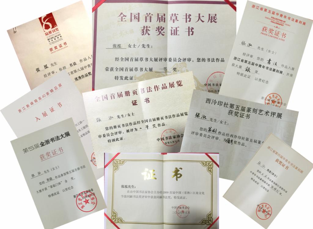 从2005年进校工作开始,张泓老师在全国、全省书协举办的书法大赛获大展中斩获了诸多大奖。如全国首届草书大展一等奖、首届江南文化节“翁同龢”奖一等奖、全国首届册页书法大展二等奖、西泠印社第五届篆刻展评优秀奖、全国首届行书展提名奖、浙江省第四届书法篆刻大展“陆维钊”奖、第五届全浙书法篆刻大展金奖等诸多书坛奖项。在成绩背后,是他日以继夜的砚田躬耕和执着于书法艺术的虔诚之心。