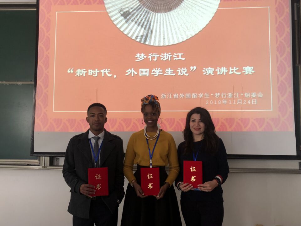 11月24日,“新时代 外国学生说”演讲比赛在浙江工商大学举行,来自37所高校的90名外国留学生参加了本次比赛。来自乌兹别克斯坦的KARIMOVA SHAHNOZA静安宁,马达加斯加的HAINGOMBALIHA ANTSANAHAR张子秋和来自卢旺达的MUKAMISHA BARBARA芭芭拉代表我校精彩亮相,经过激烈角逐,芭芭拉、张子秋、静安宁分别获得小组第三、第四、第七的好成绩。