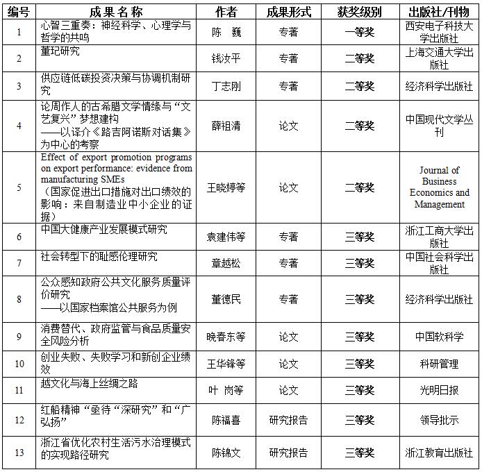 日前,绍兴市第十七届哲学社会科学优秀成果奖评选结果揭晓。我校共有13项成果获奖,其中一等奖1项,二等奖4项,三等奖8项。这是近年来我校在人文社科方面取得的较为优异的成绩。教师教育学院陈巍老师撰写的著作《心智三重奏:神经科学、心理学与哲学的共鸣》被评为一级优秀成果。