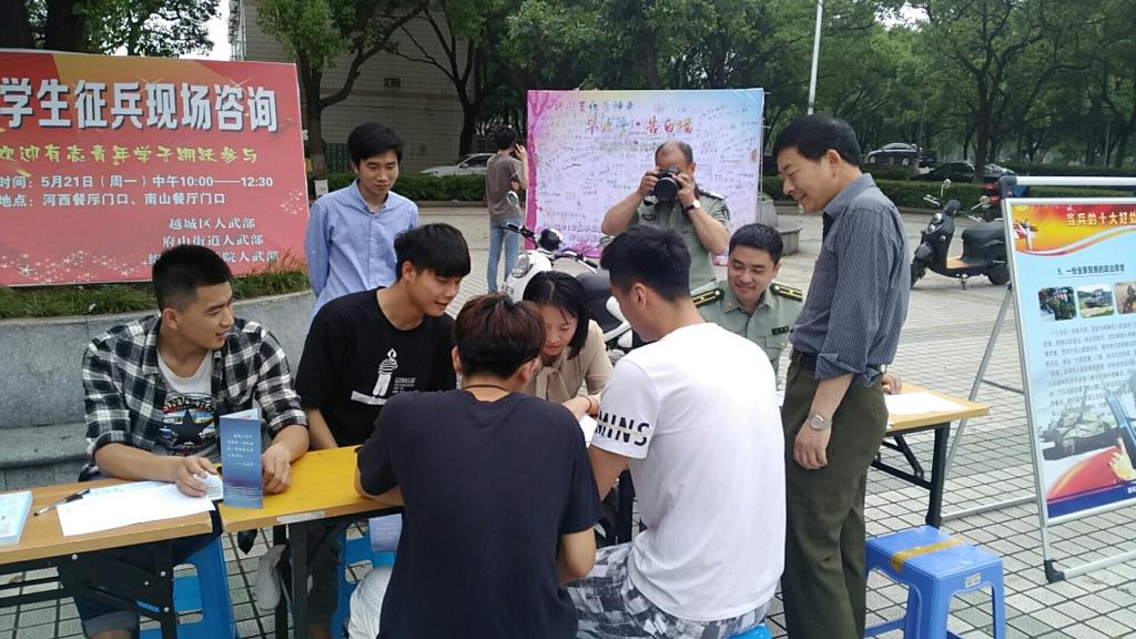 为了全力做好今年我校的征兵工作,为部队选送优秀青年,校人武部及早筹备,周全部署,打出一套征兵宣传发动“组合拳”,成效显著,在校大学生参军意愿强烈。一是召开各学院学生科负责人及人武工作专职辅导员会议,学习习近平总书记给南开大学8名新入伍大学生的回信;解读当前大学生应征入伍各项优惠政策,明确工作任务;二是完成在校男生兵役登记,覆盖率为100%,精准掌握男大学生的征兵意愿;三是联合越城区、府山街道人武部,在河西、南山校区开设2018年大学生应征入伍现场咨询会,为有意向参军的学生答疑解惑;四是利用新媒体手段,在“风则青春”“文理创就业”微信公众平台和校园电子屏上推送大学生征兵宣传资讯,取得良好的宣传效果。