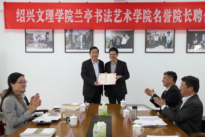 4月18日下午,兰亭书法学院名誉院长聘任仪式在兰亭书法学院会议室举行,聘任中国书法家协会主席苏士澍为我校兰亭书法艺术学院名誉院长。市人民政府副市长顾涛,校长王建力,市委教育工委书记、市教育局局长贺晓敏,市委宣传部副部长黄伟英等相关领导出席聘任仪式。仪式由党委副书记沈赤主持。