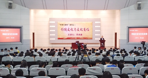 4月8日晚,我校第二场“时政大课堂”在铁城科教馆报告厅开讲。市人民政府办公室调研员李永鑫为现场450名同学作题为《传统文化与文化自信》的专题讲座。