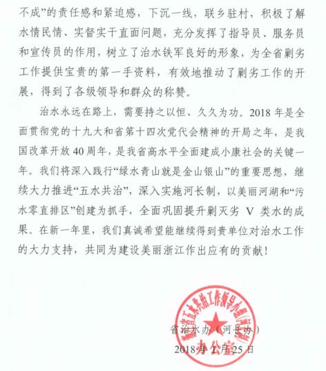 近日,浙江省五水共治工作领导小组(河长制)办公室向我校致感谢信,感谢我校派出的潘伟槐、陈建军、鲁越青、寿建昕、曹伟杰等督导员下沉一线,联乡驻村,充分发挥了指导员、服务员和宣传员的作用,树立了治水铁军良好的形象,为全省剿劣工作提供第一手资料,推动了“剿劣”工作的开展,得到各级领导和群众的称赞。