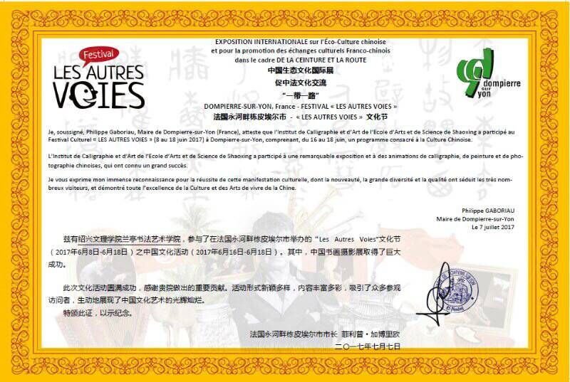今年6月,由浙江省教育书法协会、浙江省书法家协会教育委员会主办的“一带一路”中国书法国际巡展(法国站)在法国栋皮埃尔市隆重开幕。我校书法学院沈伟教授创作的有关茶文化的十副扇面作品参展。近日,栋皮埃尔市市长菲利普·加博里奥发来感谢信,感谢沈伟为此次文化活动作出的重要贡献。
