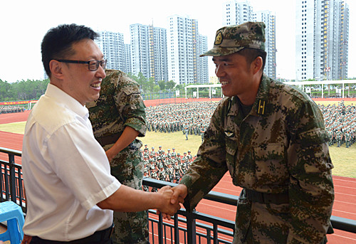在元培学院军训现场,汪俊昌观看了军训闭营式排练,详细询问了承训教官各连队的训练情况。汪俊昌对全体承训教官"高标准、严要求"的训练工作表示感谢,充分肯定承训教官们严明的军纪和过硬的施训能力。汪俊昌表示,军训已接近尾声,各连队要注意劳逸结合,留心学生身体状况,确保军训取得实效。