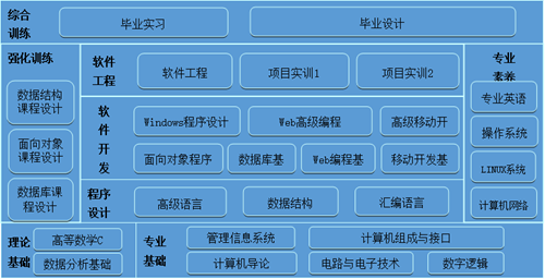 计算机科学与技术专业以企业人才需求为出发点,积极改革课程体系,开设的课程适应新技术的改造及引进,与企业岗位需求同步。根据近几年企业对移动应用领域用人需求的增加,本专业将在2017级开设《手机应用程序开发》、《移动互联网应用》等课程。